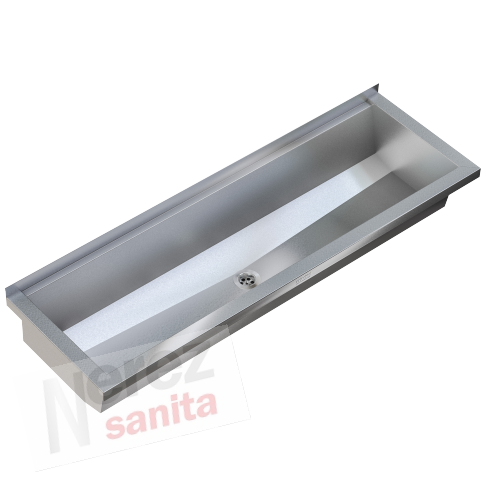 PLANOX mycí žlab beze spár svařený, k montáži na omítku, chromniklová ocel, povrch hedvábně matný, tloušťka materiálu: žlab 0,8 mm / boční stěny 1,2 mm, boční stěny s integrovanými nástěnnými konzolami, bez plochy pro baterie, bez přepadu, zadní lem 40 mm, odtok středový, sítkový ventil G 1 1/2 B, včetně upevňovacího materiálu. Od délky 1800 mm je součástí dodávky přídavná konzola. Speciální délky na vyžádání.