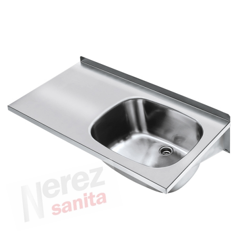 Víceúčelový dřez k montáži na stěnu, z chromniklové oceli, povrch hedvábně matný, tloušťka materiálu 1 mm, beze spár vevařená prohlubeň, zaoblené hrany, s místem pro baterii 70 mm a zadním lemem 40 mm, stojánkový trubkový ventil G 1 1/2 B z umělé hmoty, odtok vzadu uprostřed, integrované konzoly, včetně upevňovacího materiálu. Hladká odkapávací plocha.