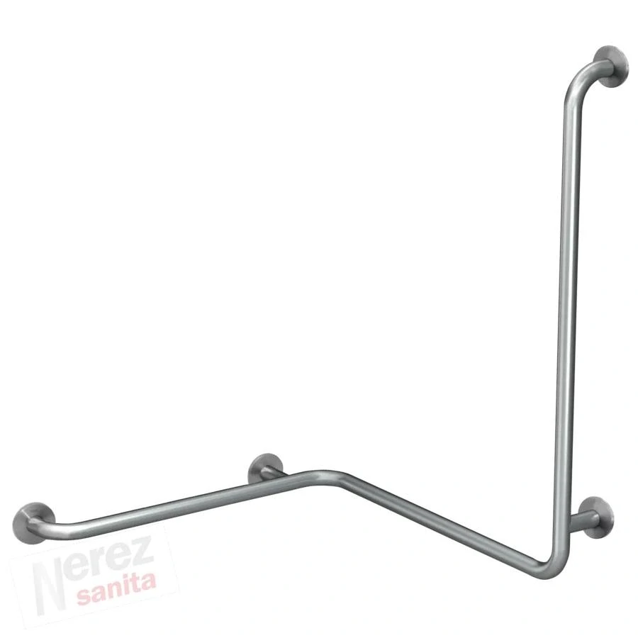 Rohové nástěnné madlo s vertikálními a horizontálními tyčovými vodítky, k povrchové montáži, nerezová ocel, saténově matná povrchová úprava, leštěná s protiskluzovým efektem, průměr trubky 32 mm, tloušťka stěny 1,2 mm, světlá výška od stěny 82 mm, se čtyřmi rozetami z nerezové oceli pro skrytou montáž, včetně vrutů a hmoždinek z nerezové oceli.