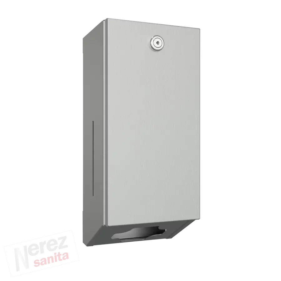 Zásobník na toaletní papír RODAN pro povrchovou montáž, nerez, satén, tloušťka materiálu 0,8 mm, uzavřené pouzdro se sklopným čelem, cylindrický zámek se standardním klíčem, průhledové okénko na boku, kapacita 450 - 500 ks toaletního papíru dle ohybu, včetně nerezových šroubů a hmoždinek.